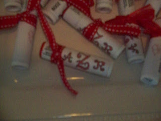 So, for the shower favor I put labes with her initials and the shower date around a tube of Chapstick. :) (Sorry it's a bit blurry)